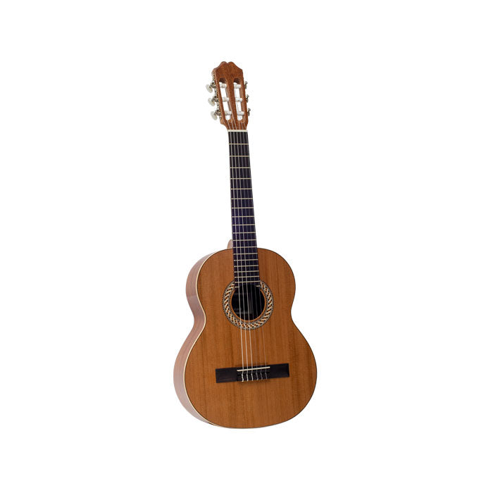 Het formaat van een klassieke gitaar kan voor tieners, jongvolwassenen, maar ook sommige volwassenen simpelweg een maatje te groot zijn. Daarom biedt Juan Salvador met de 2C Señorita een 7/8 model waarmee iedereen met een (nog) wat kleinere lichaamsbouw ook de gelegenheid krijgt om met een volwassen klassieke gitaar te spelen en op les te gaan. De 2C Señorita biedt alle aspecten van de 4/4 variant, dus het massief Amerikaans cederen bovenblad, de zij- en achterkant van mahonie (sapeli), de heerlijke mahonie hals met palissander toets, de zuivere Van Gent stemmechanieken, de fraaie glanzende afwerking en de klassieke warme, gedefinieerde toon waar volwaardige klassieke gitaren over beschikken. Dit is het perfecte instrument voor diegenen die het gitaar spelen leuk vinden, het serieus nemen en les nemen en bij wie de 7/8 afmeting beter past.