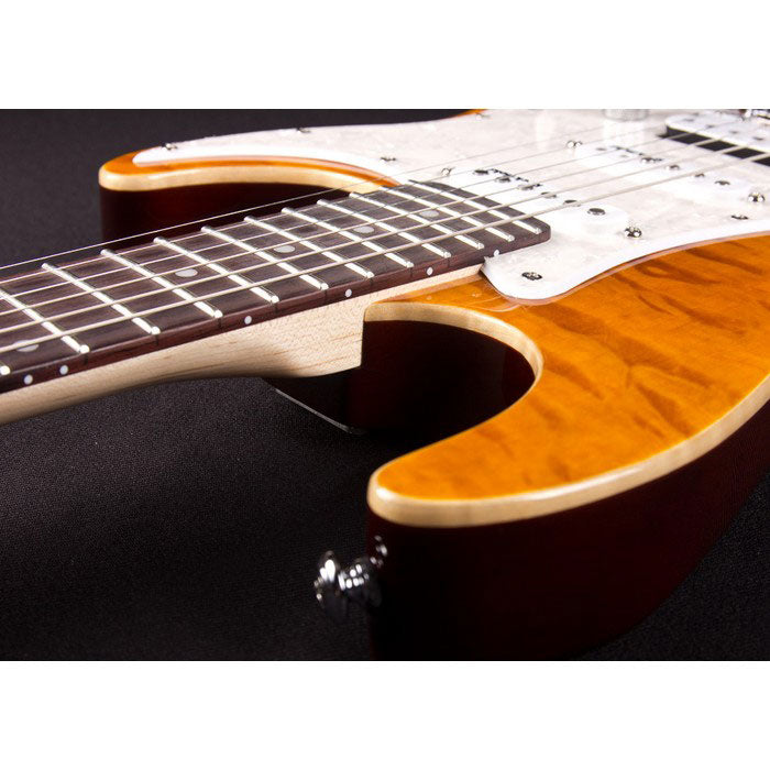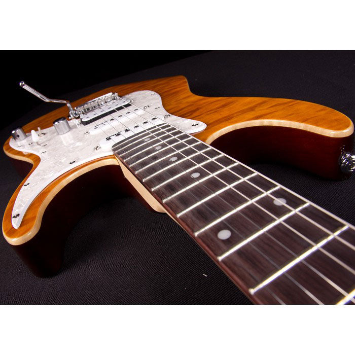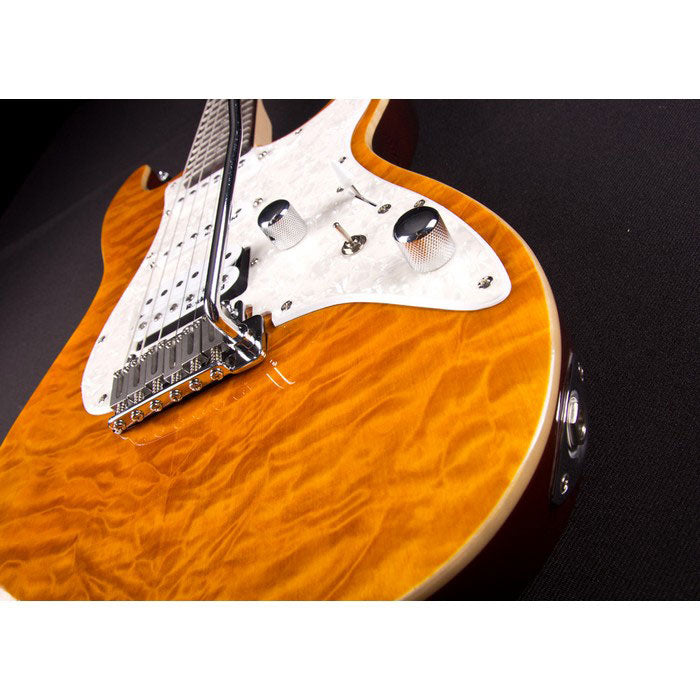 The perfect boutique double-cut for today's player. The body is swamp ash with a highly figured quilt maple top, we then perfect the body with the addition of real flame maple binding. The maple neck has a rosewood fingerboard with a compound radius, this is made for today's more complex playing requirements. The 1965 is upgraded with our Epic Eleven electronics mod. With this hot rodded approach you can access 11 unique sounds. The '65 comes with Rockfield pickups voiced specifically for this guitar. We finish this off by adding a smooth two point tremolo and locking Grover tuners. Get your hands on a 1965 for yourself to enjoy this perfect combination.