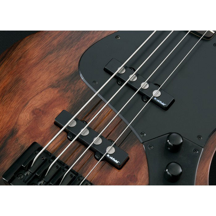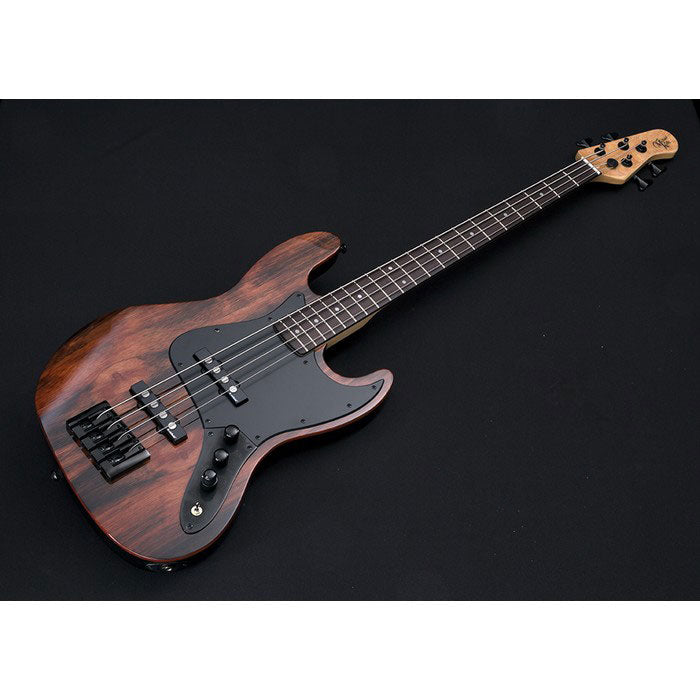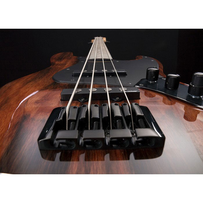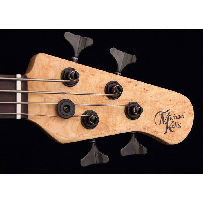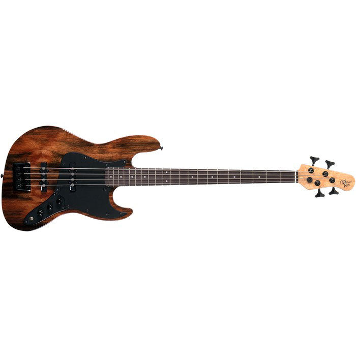 The Custom Collection Element 4 bass was designed for players who prefer a modernized take on a classic. The basic body lines might look familiar, but the MK designers took liberties to enhance comfort and playability. You can select from three different top woods, each accented with black hardware. What makes this bass special is far deeper than the striking appearance. We carefully selected each detail and spec to deliver a great bass for stage or studio. The impact of a bridge on the performance of a bass guitar is something that many often underestimate. In fact, the bridge is key to many aspects of tone and we gave it the full respect that it deserved. You will see that we used a solid molded bridge with tight slots for each fully-adjustable saddle, a big enhancement on its own. We, however, took that further. Below that bridge is an aluminum tone block. We add that hidden block to add sustain and attack. Since it is aluminum, it does not add weight to the bass, but has a similar sonic impact to using a heavy bridge. We call this bridge-and-internal-block combination the MK Stealth Attack Bridge System. The pickups, controls, and electronics are another area where we did extensive testing and enhancements to get a great result. The pickups were developed specifically for the MK Element bass line by Rockfield and they have an over-wound classic pickup sonic performance. We blend that with our newly-developed Element Active Circuit that has been carefully tweaked to provide a modern sonic profile. Also key to our design was allowing excellent user customization potential using the onboard controls. Those controls include offering you a stacked tone pot with separate treble and bass controls. There is also a blend via a blend knob to sweep from one pickup to the other or varying degrees of each. Also included is a bypass switch allowing you to go from active to a very vintage passive tone with a quick click. Finally, to add to the comfort of this bass we built it using Red Cedar. This wood from the mahogany family is a great tonewood that allowed us to deliver the powerful sound that we were committed to. However it is a lighter weight wood which allowed us to reduce the overall instrument weight. This was something that had been requested by players and the careful combination of the woods and other design aspects makes the Custom Collection Element bass especially comfortable to play. There are many important aspects of the Custom Collection Element bass that you will want to see.