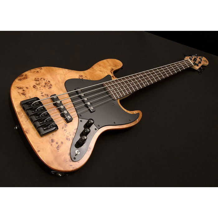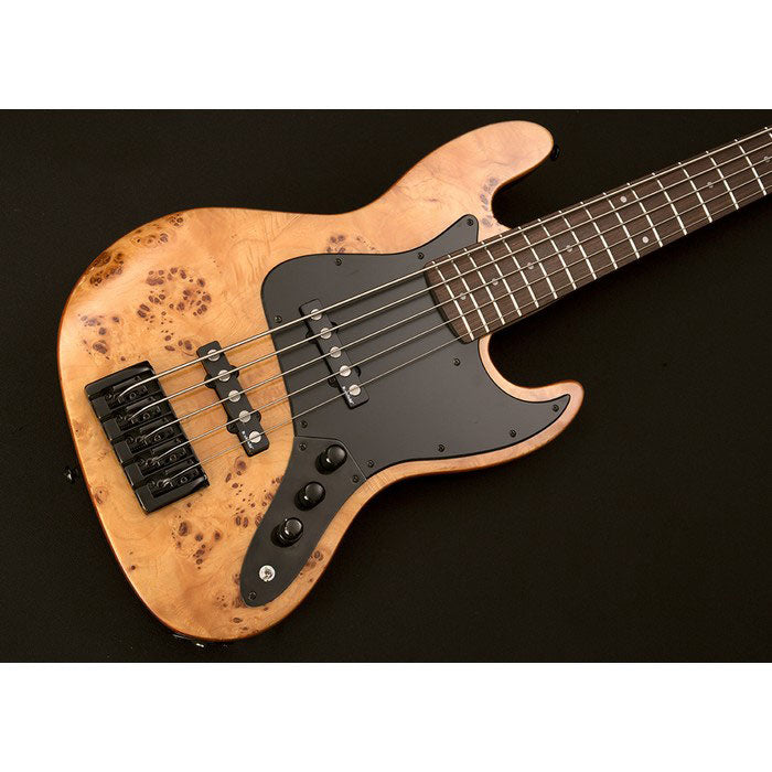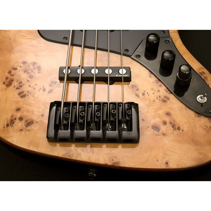 The Custom Collection Element 5 bass was designed for players who prefer a modernized take on a classic. The basic body lines might look familiar, but the MK designers took liberties to enhance comfort and playability. You can select from three different top woods, each accented with black hardware. What makes this bass special is far deeper than the striking appearance. We carefully selected each detail and spec to deliver a great bass for stage or studio. The impact of a bridge on the performance of a bass guitar is something that people too often underestimate. In fact, the bridge is key to many aspects of tone and we gave it the full respect that it deserved. You will see that we used a solid molded bridge with tight slots for each fully-adjustable saddle, a big enhancement on its own. We, however, took that further. Below that bridge is an aluminum tone block. We add that hidden block to add sustain and attack. Since it is aluminum, it does not add weight to the bass, but has a similar sonic impact to using a heavy bridge. We call this bridge-and-internal-block combination the MK Stealth Attack Bridge System. The pickups, controls, and electronics are another area where we did extensive testing and enhancements to get a great result. The pickups were developed specifically for the MK Element bass line by Rockfield and they have an over-wound classic pickup sonic performance. We blend that with our newly-developed Element Active Circuit that has been carefully tweaked to provide a modern sonic profile. Also key to our design was allowing excellent user customization potential using the onboard controls. Those controls include offering you a stacked tone pot with separate treble and bass controls. There is also a blend via a blend knob to sweep from one pickup to the other or varying degrees of each. Also included is a bypass switch allowing you to go from active to a very vintage passive tone with a quick click. Finally, to add to the comfort of this bass we built it using Red Cedar. This wood from the mahogany family is a great tonewood that allowed us to deliver the powerful sound that we were committed to. However it is a lighter weight wood which allowed us to reduce the overall instrument weight. This was something that had been requested by players and the careful combination of the woods and other design aspects makes the Custom Collection Element bass especially comfortable to play. There are many important aspects of the Custom Collection Element bass.
