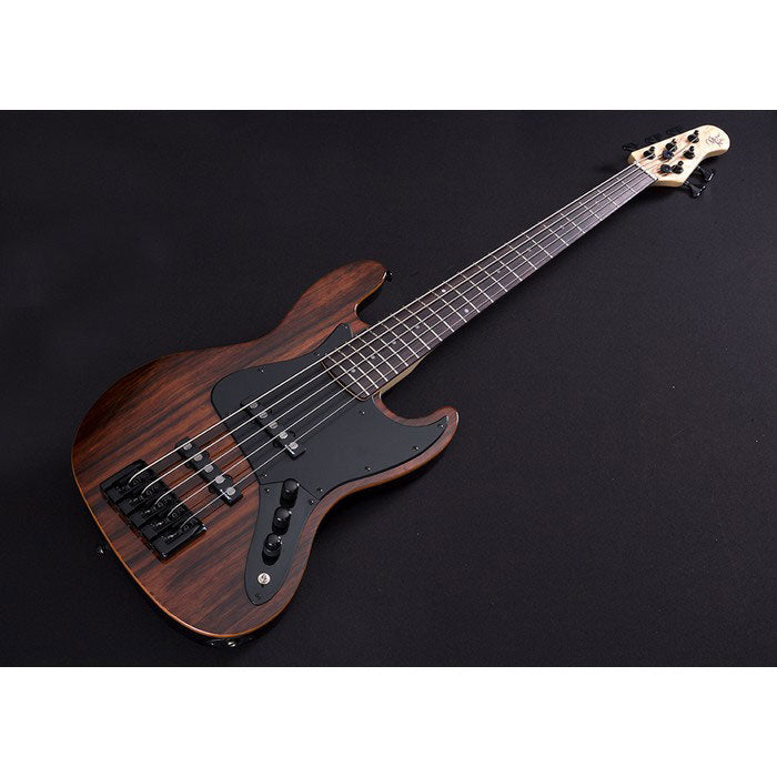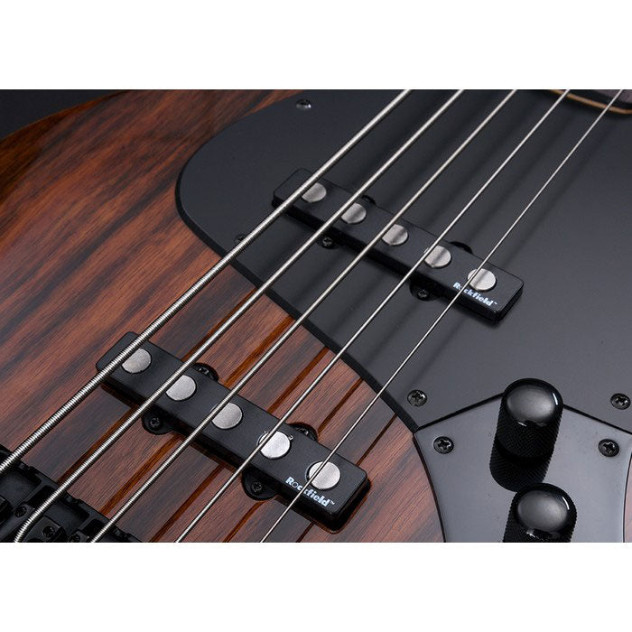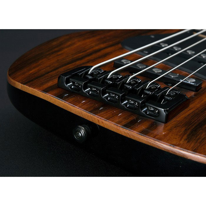 The Custom Collection Element 5 bass was designed for players who prefer a modernized take on a classic. The basic body lines might look familiar, but the MK designers took liberties to enhance comfort and playability. You can select from three different top woods, each accented with black hardware. What makes this bass special is far deeper than the striking appearance. We carefully selected each detail and spec to deliver a great bass for stage or studio. The impact of a bridge on the performance of a bass guitar is something that people too often underestimate. In fact, the bridge is key to many aspects of tone and we gave it the full respect that it deserved. You will see that we used a solid molded bridge with tight slots for each fully-adjustable saddle, a big enhancement on its own. We, however, took that further. Below that bridge is an aluminum tone block. We add that hidden block to add sustain and attack. Since it is aluminum, it does not add weight to the bass, but has a similar sonic impact to using a heavy bridge. We call this bridge-and-internal-block combination the MK Stealth Attack Bridge System. The pickups, controls, and electronics are another area where we did extensive testing and enhancements to get a great result. The pickups were developed specifically for the MK Element bass line by Rockfield and they have an over-wound classic pickup sonic performance. We blend that with our newly-developed Element Active Circuit that has been carefully tweaked to provide a modern sonic profile. Also key to our design was allowing excellent user customization potential using the onboard controls. Those controls include offering you a stacked tone pot with separate treble and bass controls. There is also a blend via a blend knob to sweep from one pickup to the other or varying degrees of each. Also included is a bypass switch allowing you to go from active to a very vintage passive tone with a quick click. Finally, to add to the comfort of this bass we built it using Red Cedar. This wood from the mahogany family is a great tonewood that allowed us to deliver the powerful sound that we were committed to. However it is a lighter weight wood which allowed us to reduce the overall instrument weight. This was something that had been requested by players and the careful combination of the woods and other design aspects makes the Custom Collection Element bass especially comfortable to play. There are many important aspects of the Custom Collection Element bass.